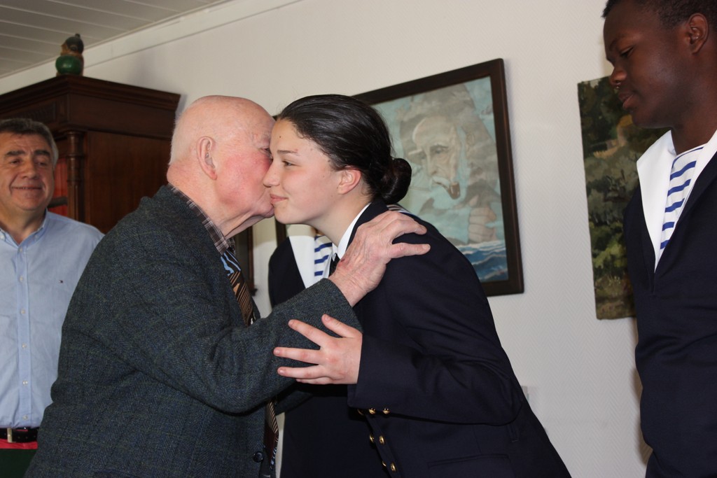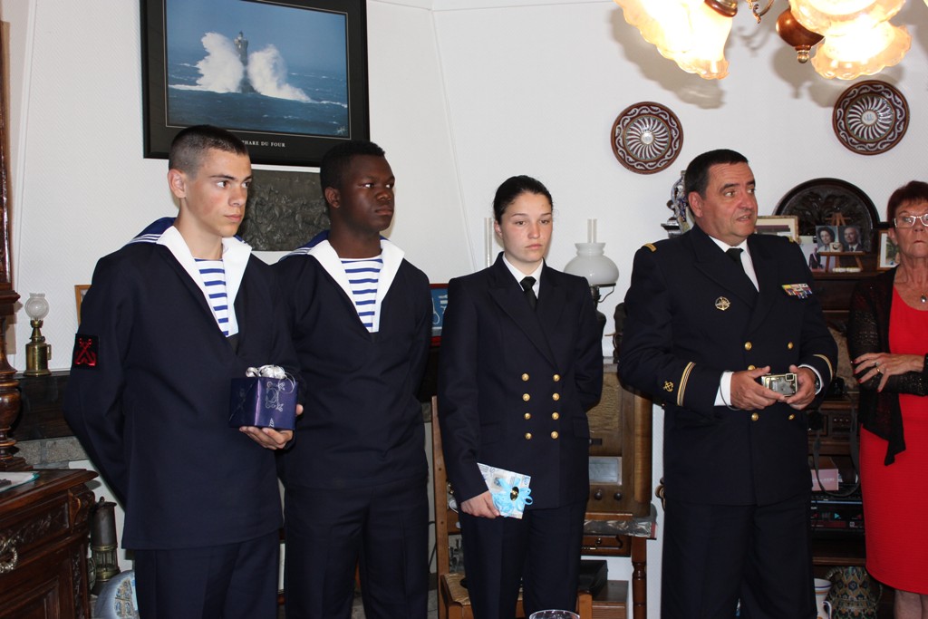 Le mardi 29 septembre 2015, notre doyen a reçu à son domicile la visite de membres du comité régional Bretagne Manche de l'amicale : René Runavot (mousse 1938), Guy Josselin (mousse 1946), Norbert Robillard (mousse 1957), Jacques Guyomard (mousse 938). Ils étaient accompagnés d'une délégation de l'Ecole des mousses, composée du major Le Feuch et de trois mousses. Etait également présent le maître Le Guellec, du CIRFA de Saint-Brieuc.