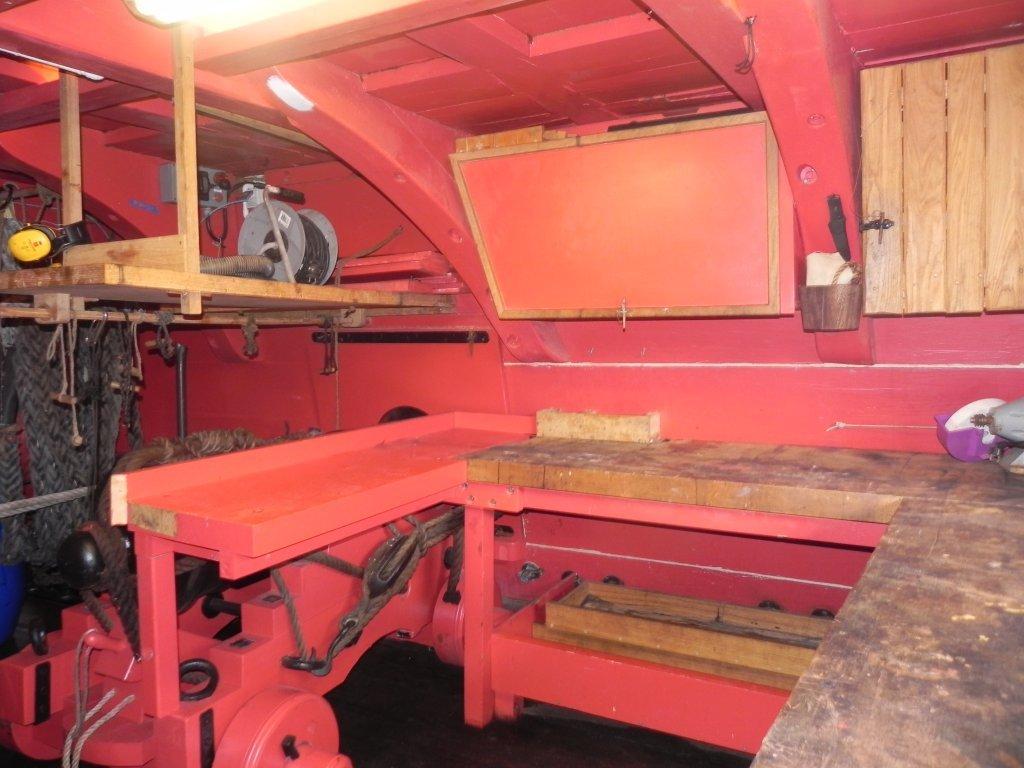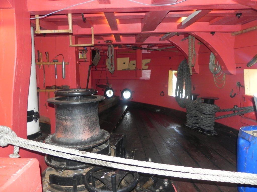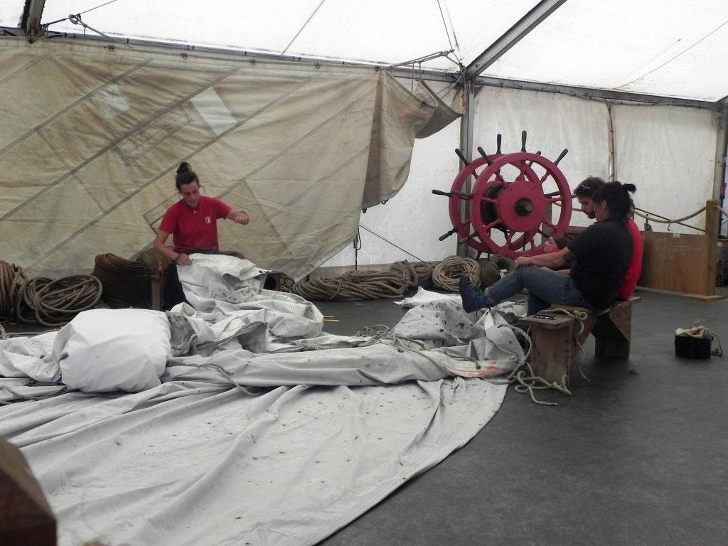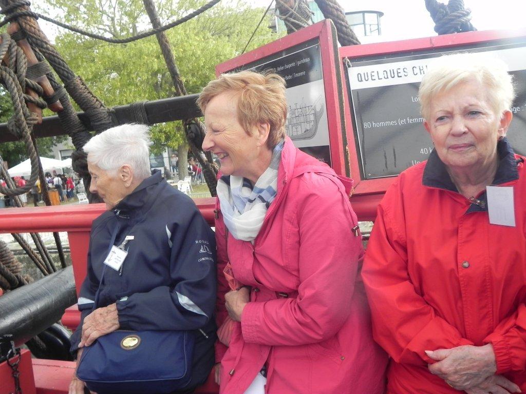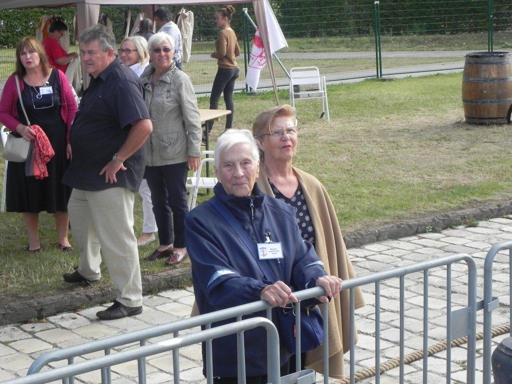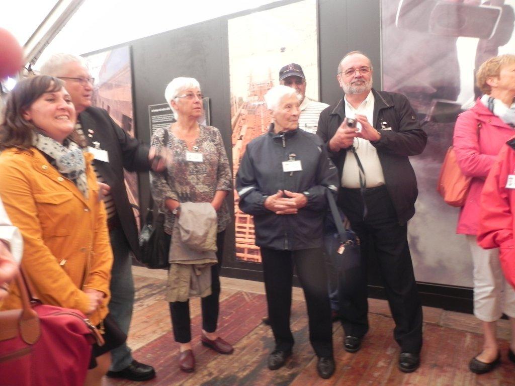 Une jeune femme nous attendait pour nous guider au travers du «Chantier Hermione ». Elle nous fit tout d’abord un résumé historique, car c’est à bord de cette frégatenqu’en 1780 La Fayette est parti prévenir son ami le général Washington de l’arrivée imminente de l’armée française. Nous avons ensuite traversé successivement les différents chantiers, menuiserie, sellerie, forge etc… avec un arrêt particulier à la voilerie où deux demoiselles étaient en train de faire des œillets dans la toile d’un taud destiné à la frégate, tout cela accompagné, dès l’entrée, par la bonne odeur du chanvre goudronné. La visite du « Chantier » terminée, nous approchâmes enfin « L’Hermione ». La frégate que certains d’entre nous avaient vu construire au cours de ces dix-sept dernières années avait fière allure sous le soleil automnal. Visite instructive du pont batterie et du grand cabestan. Explications sur le fonctionnement des canons et sur la vie à bord. Le gréement est impressionnant : 28 Kms de bouts et 700 poulies. Le grand mât culmine à 54 mètres et il faut manœuvrer 2200 m2 de voilure.