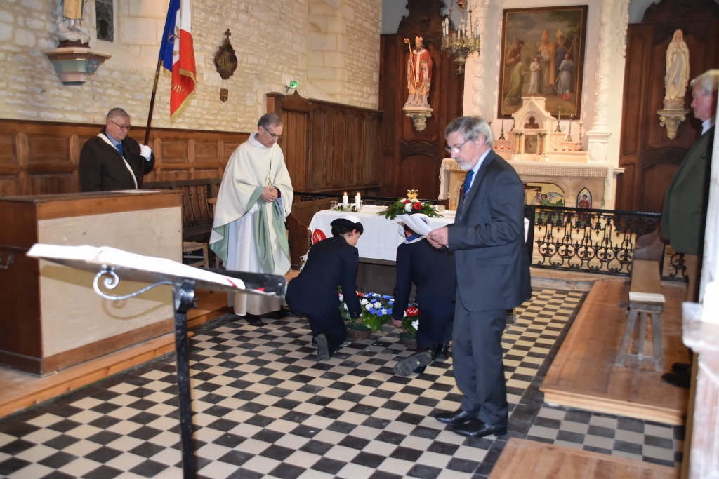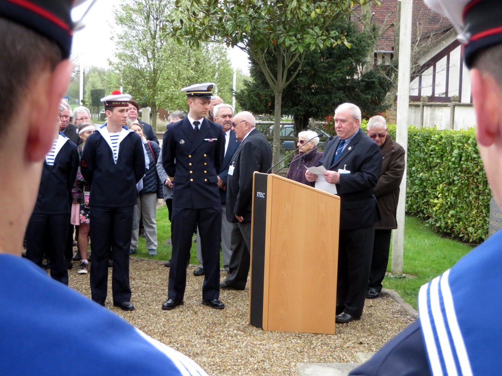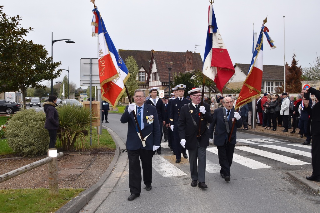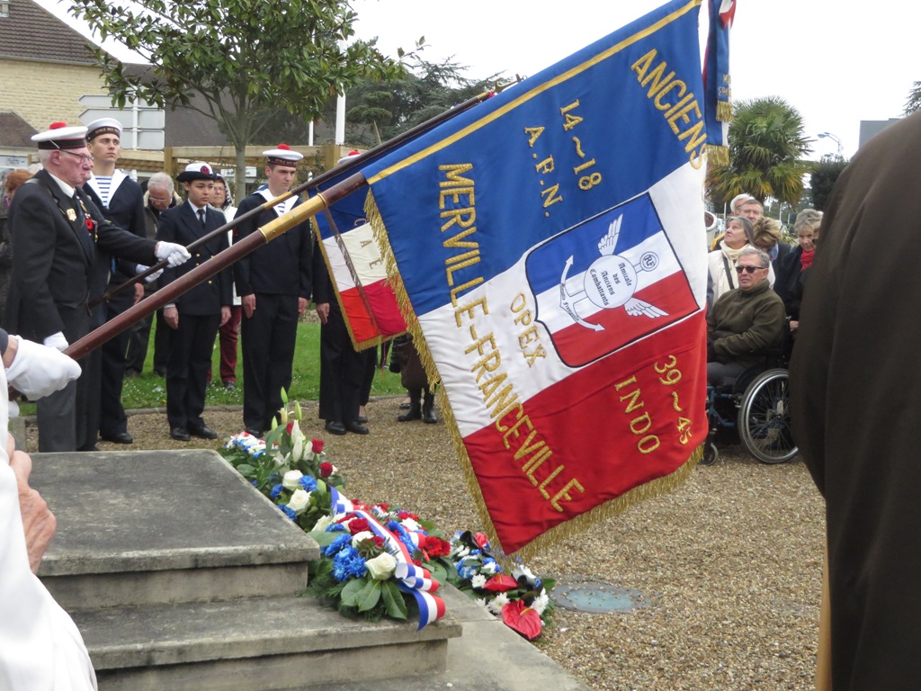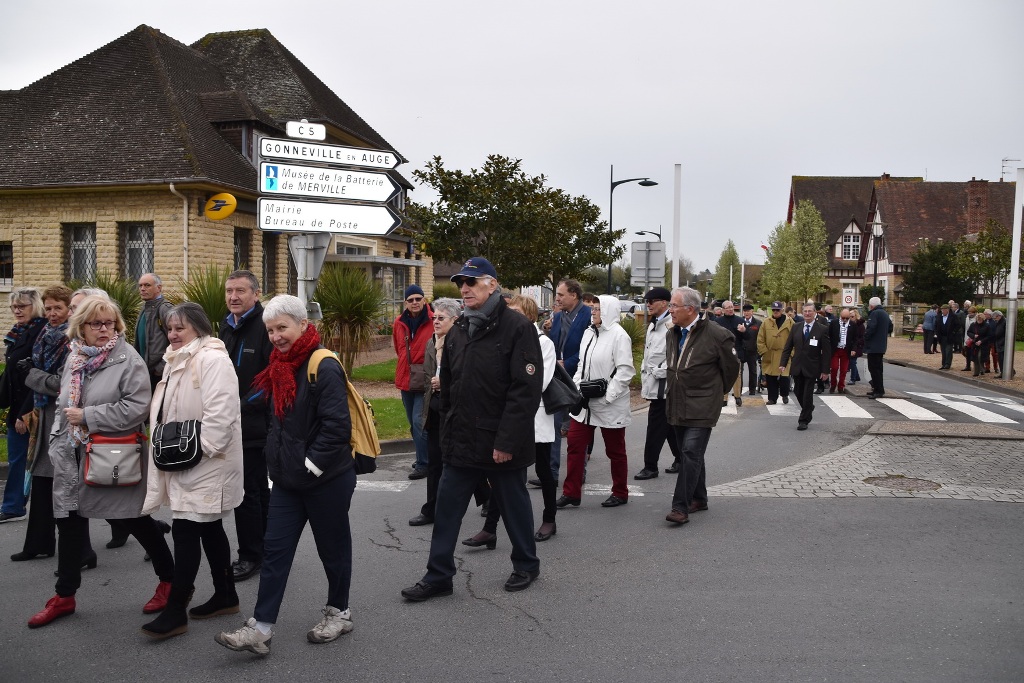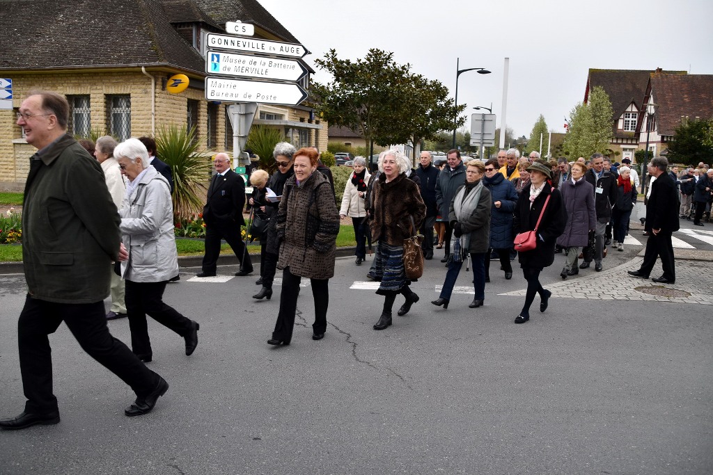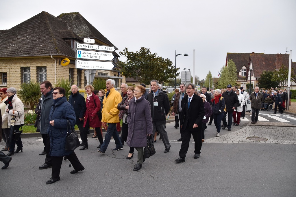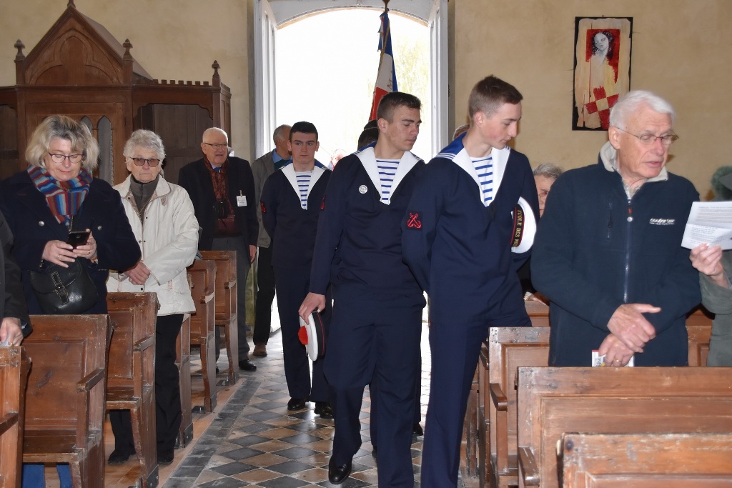 Le dimanche à 9 heures les fidèles se retrouvent à l’église Saint Germain, qui appartient à la famille de l’amiral de Castelbajac, mais est aussi l'église du village de Merville. La messe est célébrée par le père Vimard, attaché à la marine marchande et à la pêche professionnelle. Une délégation de 7 mousses et 2 instructeurs sont venus de Cherbourg pour cette journée. Un peu plus tard tout le monde se rend au monument aux morts de Merville. Notons la présence de nombreux élus, Maire de Merville, député, conseillères départementale et régionale. Le Colonel Délégué Militaire Départemental nous a fait l’honneur d’être présent. Le Maire de Merville puis le député du Calvados font des allocutions très écoutées. C’est Raymond PAULARD qui donne lecture du texte préparé par le président. Cinq Gerbes sont déposées portées par des mousses et des enfants de la ville. Puis, un moment de recueillement est observé par l’assistance qui entonne la Marseillaise après ce silence. Le verre de l’amitié est offert par Monsieur le Maire à la salle des fêtes.