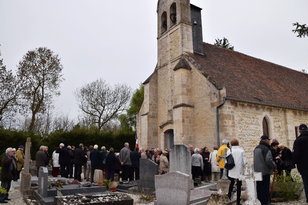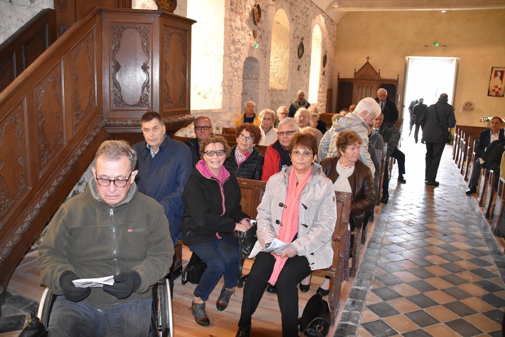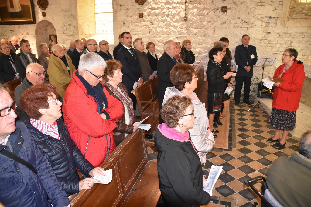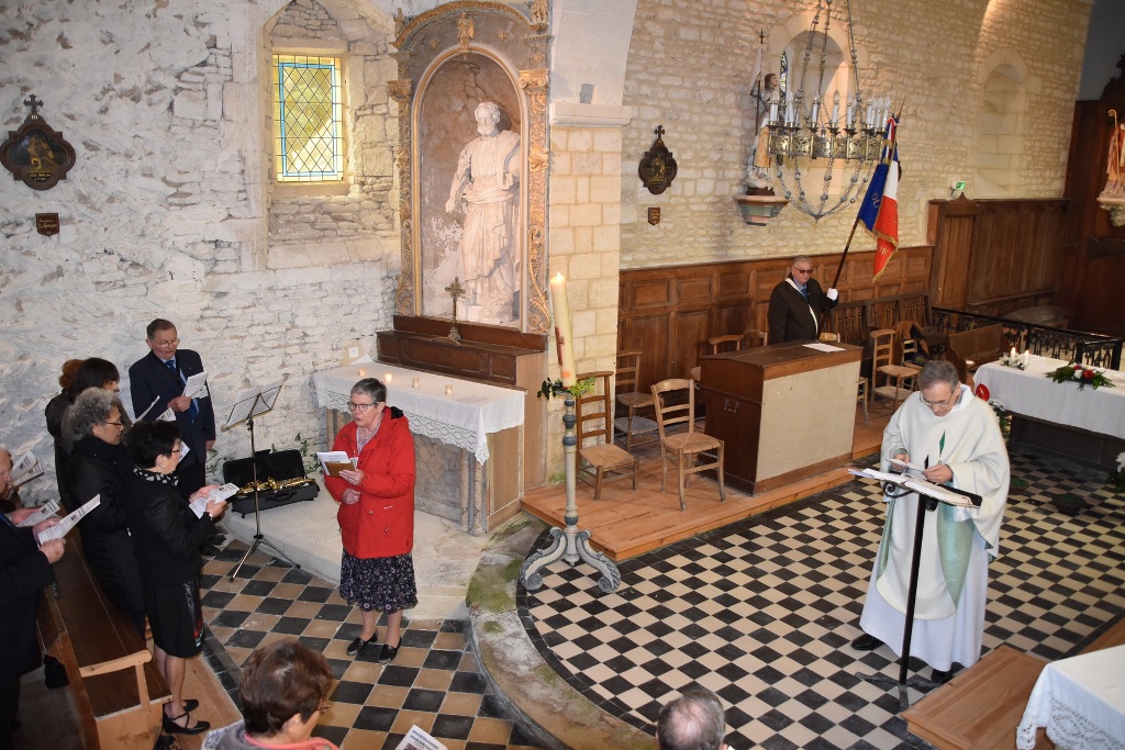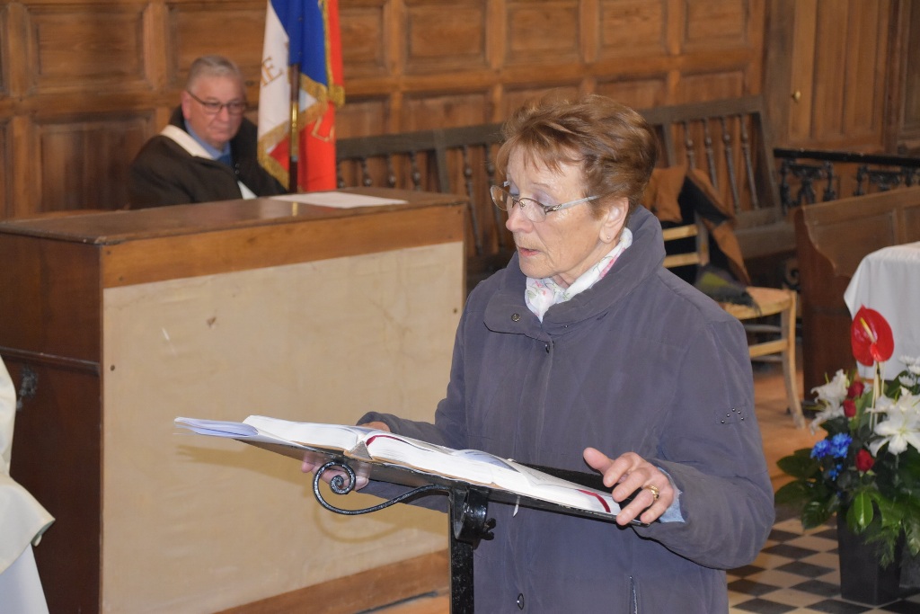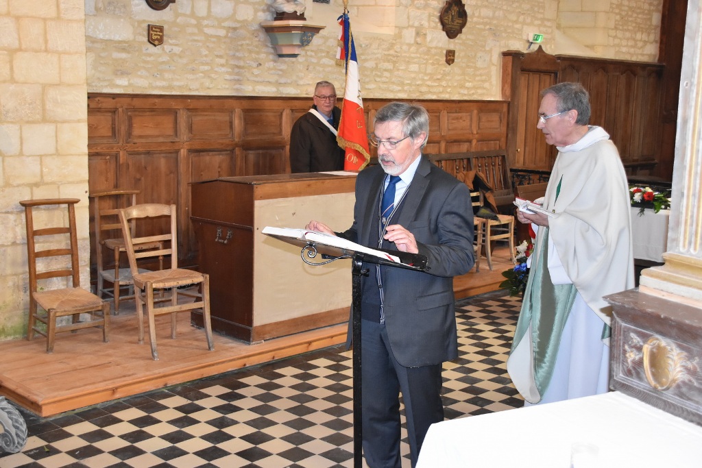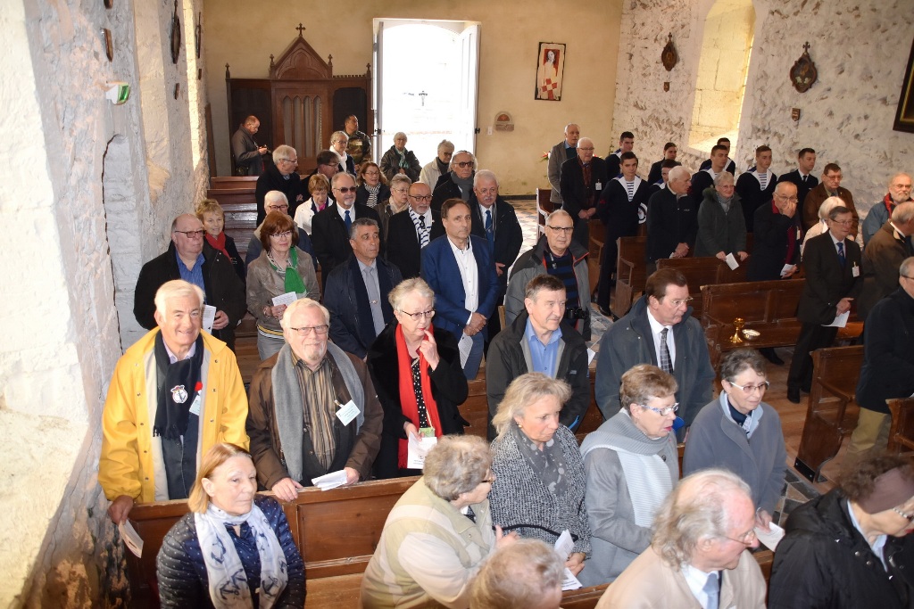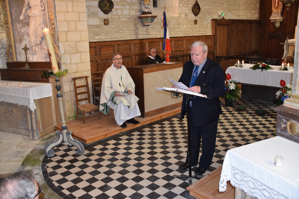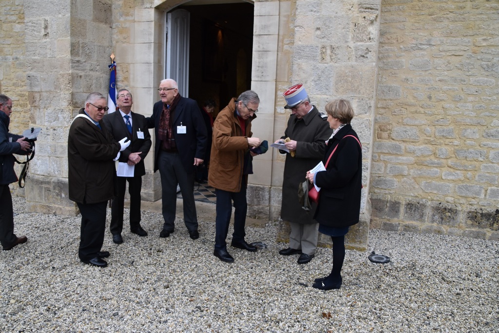 Le dimanche à 9 heures les fidèles se retrouvent à l’église Saint Germain, qui appartient à la famille de l’amiral de Castelbajac, mais est aussi l'église du village de Merville. La messe est célébrée par le père Vimard, attaché à la marine marchande et à la pêche professionnelle. Une délégation de 7 mousses et 2 instructeurs sont venus de Cherbourg pour cette journée. Un peu plus tard tout le monde se rend au monument aux morts de Merville. Notons la présence de nombreux élus, Maire de Merville, député, conseillères départementale et régionale. Le Colonel Délégué Militaire Départemental nous a fait l’honneur d’être présent. Le Maire de Merville puis le député du Calvados font des allocutions très écoutées. C’est Raymond PAULARD qui donne lecture du texte préparé par le président. Cinq Gerbes sont déposées portées par des mousses et des enfants de la ville. Puis, un moment de recueillement est observé par l’assistance qui entonne la Marseillaise après ce silence. Le verre de l’amitié est offert par Monsieur le Maire à la salle des fêtes.