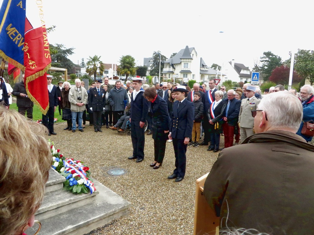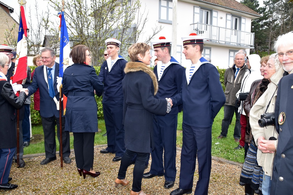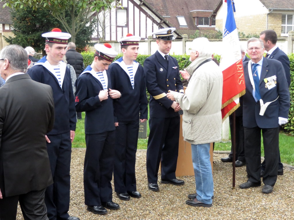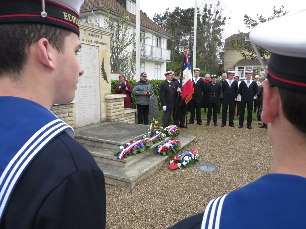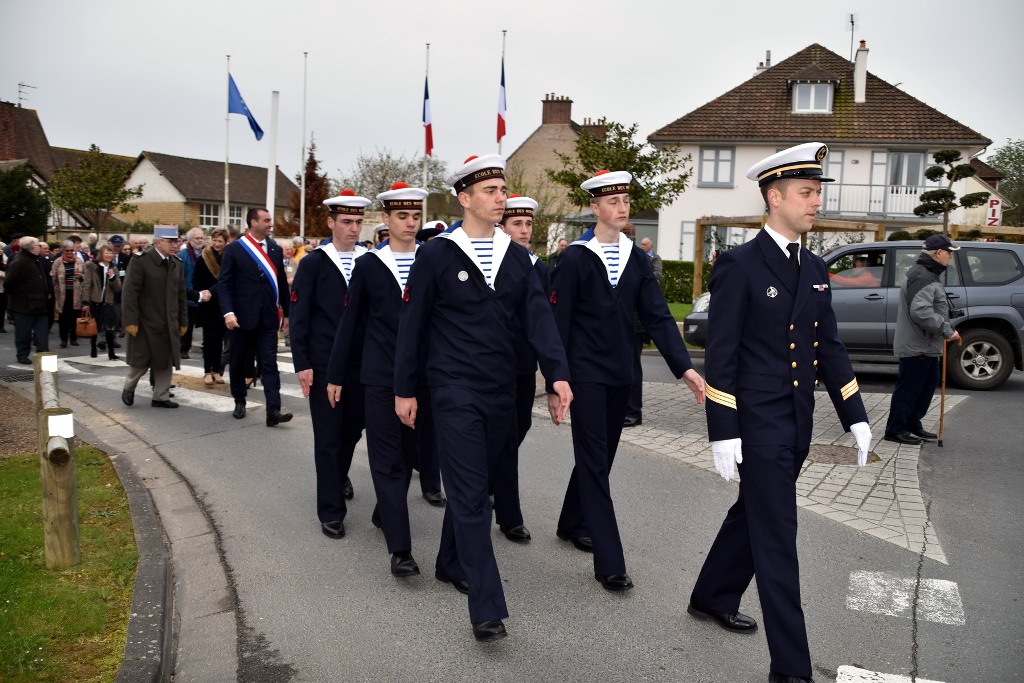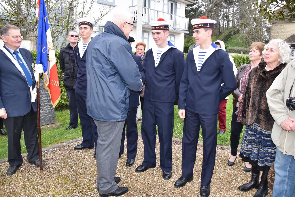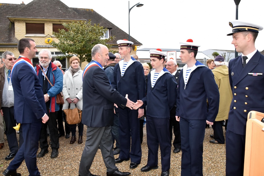 Puis cérémonie au monument aux Morts, en présence d'une délégation de mousses de l’école de Cherbourg et du Délégué Militaire Départemental, mais aussi de nombreux élus locaux : maire, député, représentants du sénateur, du président du conseil départemental et du président du conseil régional, Monsieur Hervé Morin, qui a été à l’initiative de la réouverture de notre école.