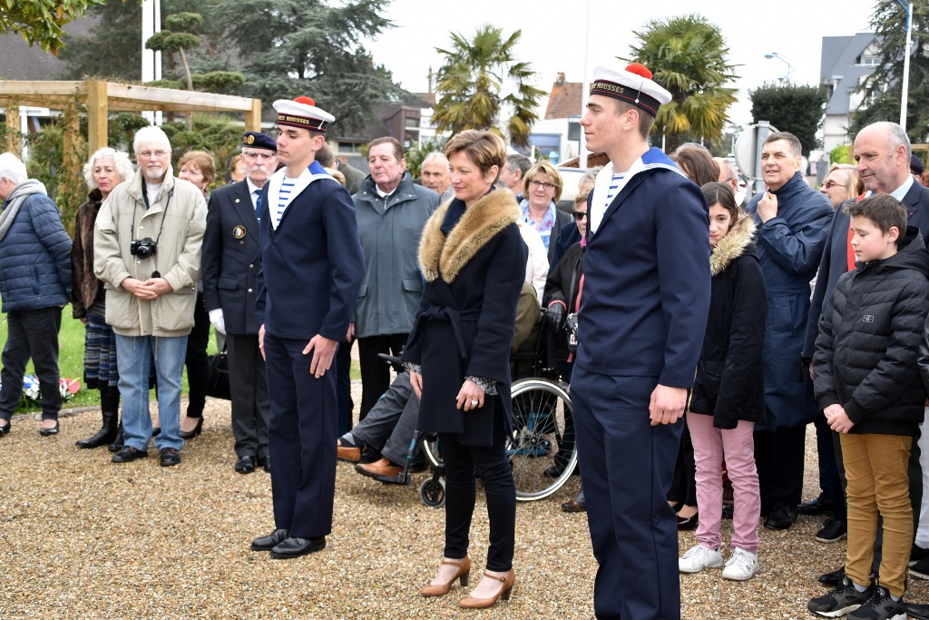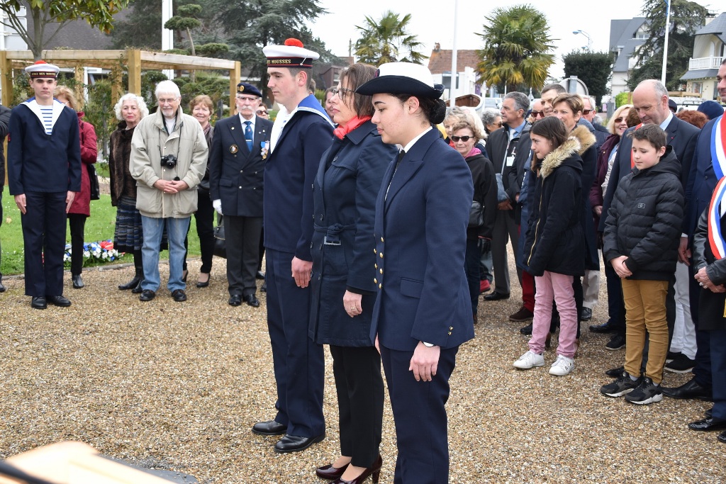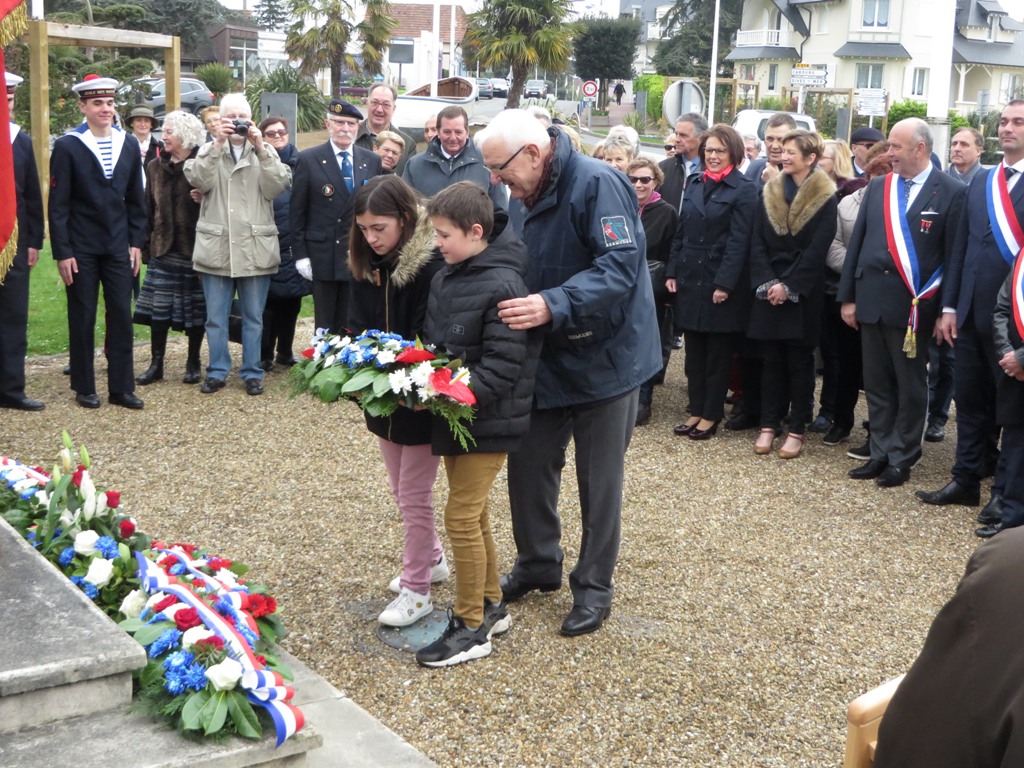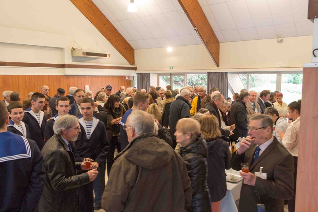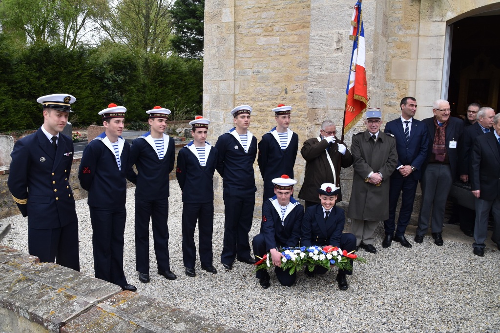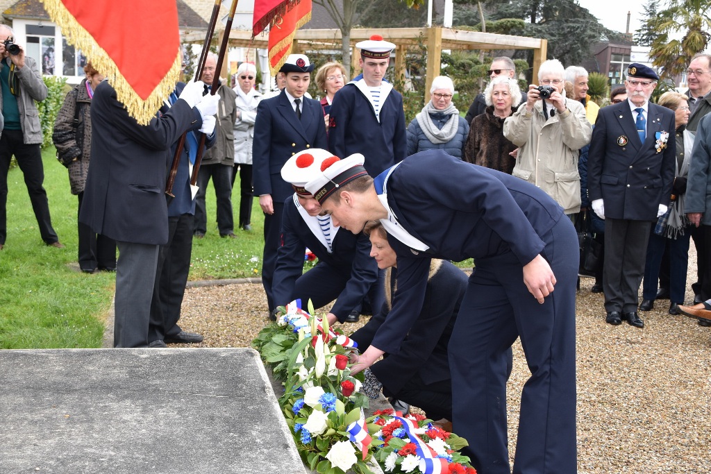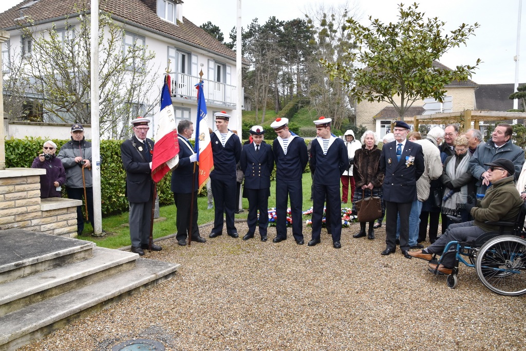Puis cérémonie au monument aux Morts, en présence d'une délégation de mousses de l’école de Cherbourg et du Délégué Militaire Départemental, mais aussi de nombreux élus locaux : maire, député, représentants du sénateur, du président du conseil départemental et du président du conseil régional, Monsieur Hervé Morin, qui a été à l’initiative de la réouverture de notre école.