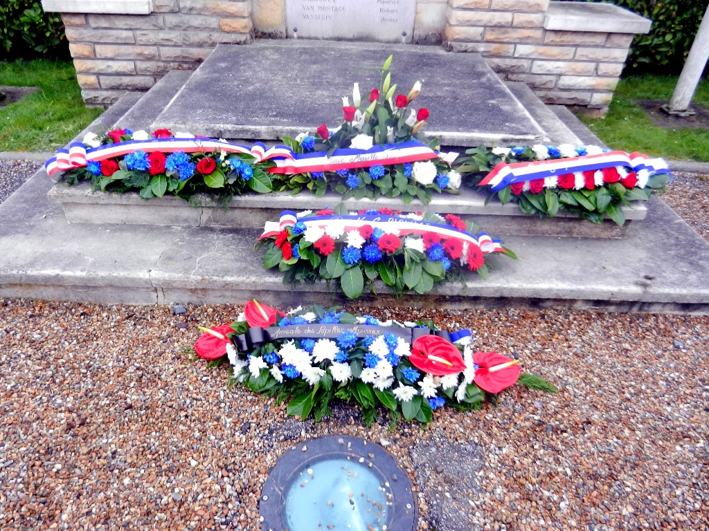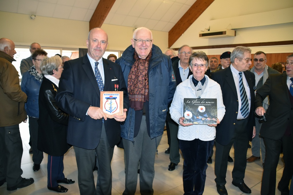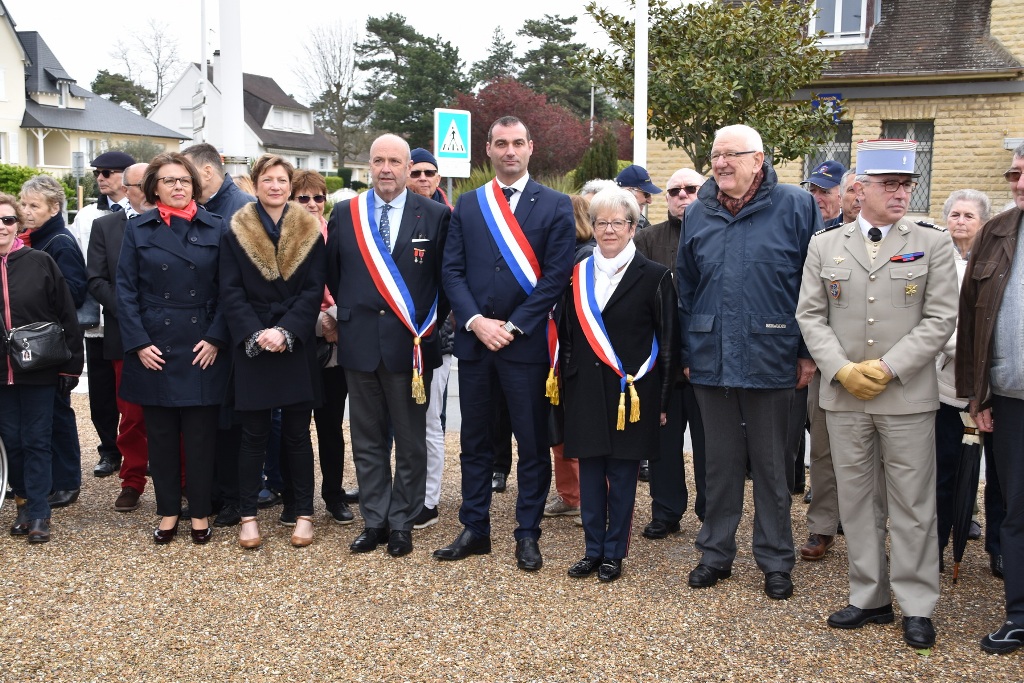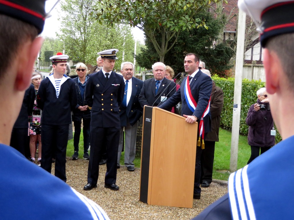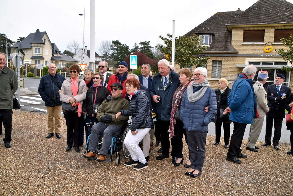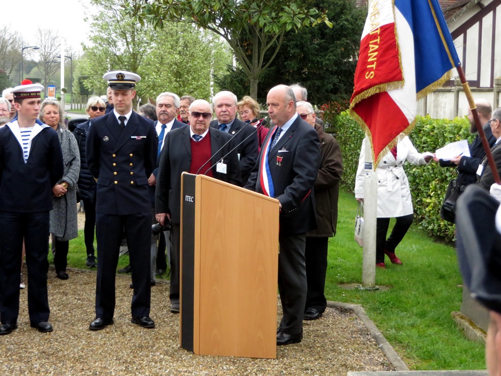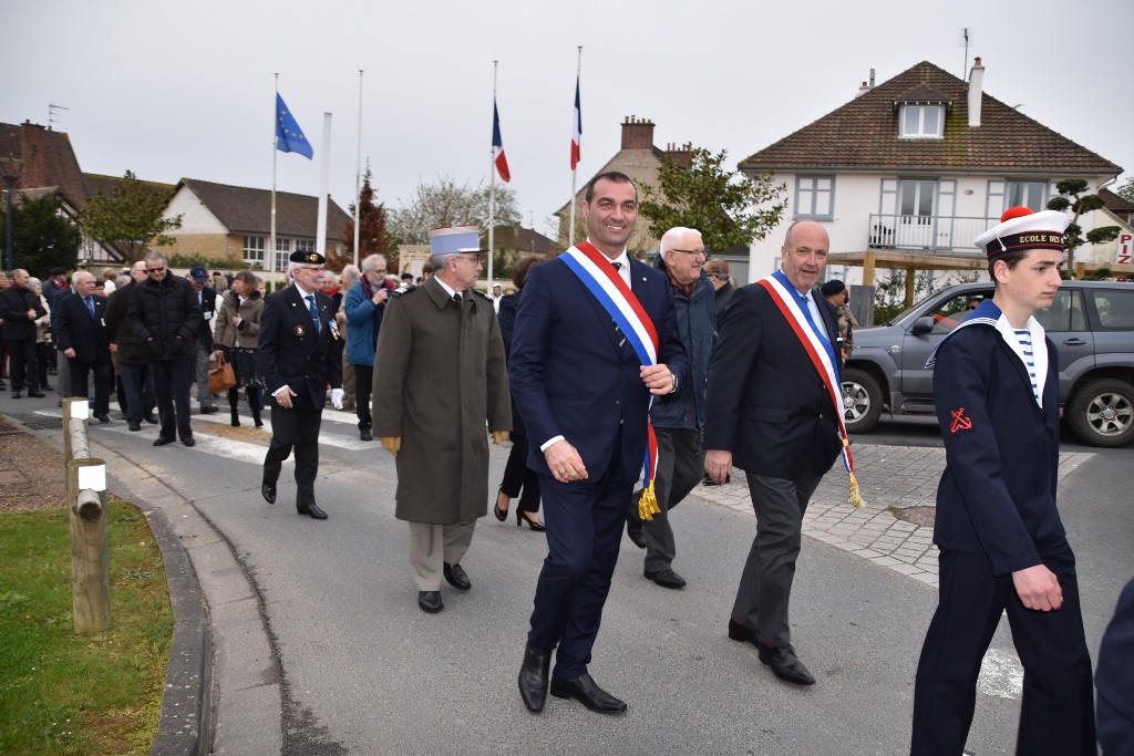 Puis cérémonie au monument aux Morts, en présence d'une délégation de mousses de l’école de Cherbourg et du Délégué Militaire Départemental, mais aussi de nombreux élus locaux : maire, député, représentants du sénateur, du président du conseil départemental et du président du conseil régional, Monsieur Hervé Morin, qui a été à l’initiative de la réouverture de notre école.