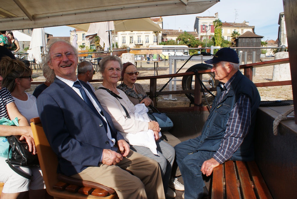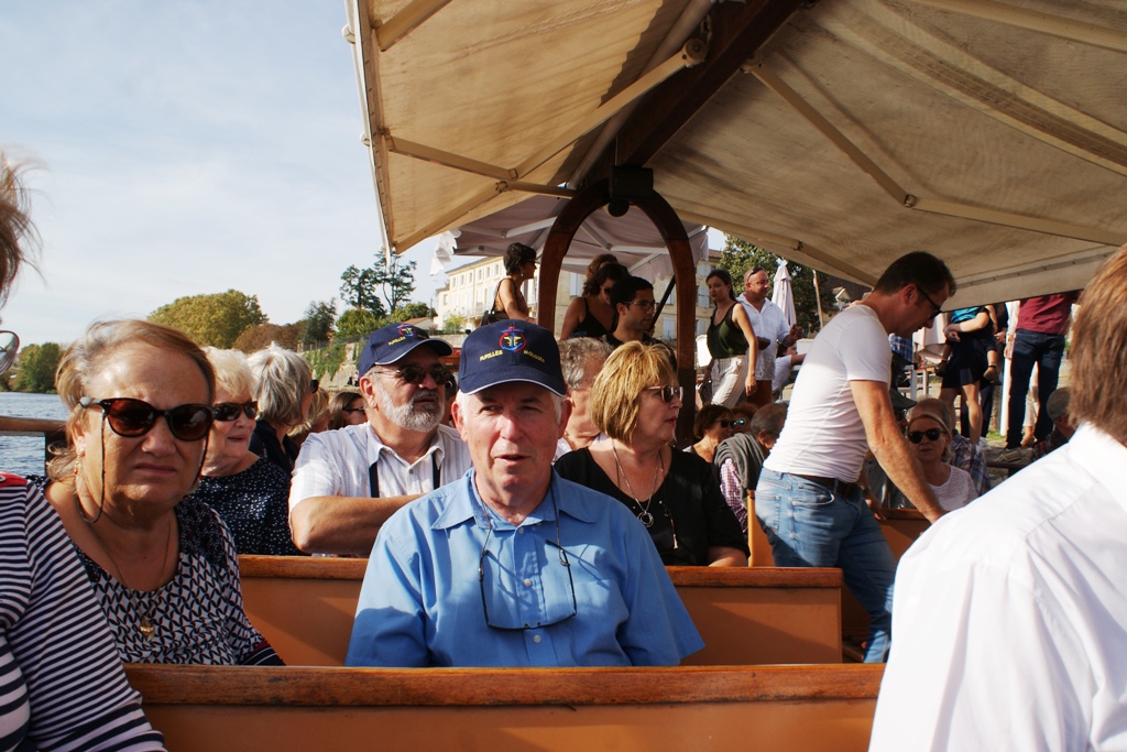 Direction, en convoi et en voiture, Bergerac, où une gabarre nous attend sur le fleuve (et non la rivière, puisque la Dordogne se jette dans l’estuaire de la Gironde, et non dans la Garonne comme nous l’expliquera le guide). Aucun problème pour embarquer, le léger clapot ne faisant même pas osciller l’embarcation et tout le monde ayant le pied marin. Très belle balade sur la rivière espérance (pardon, le fleuve) commentée pendant plus d’une heure sous un soleil radieux et qui plus est sans tirer sur le bois mort, ce qui nous aurait rappelé « le bon temps » passé dans les écoles de la Marine.