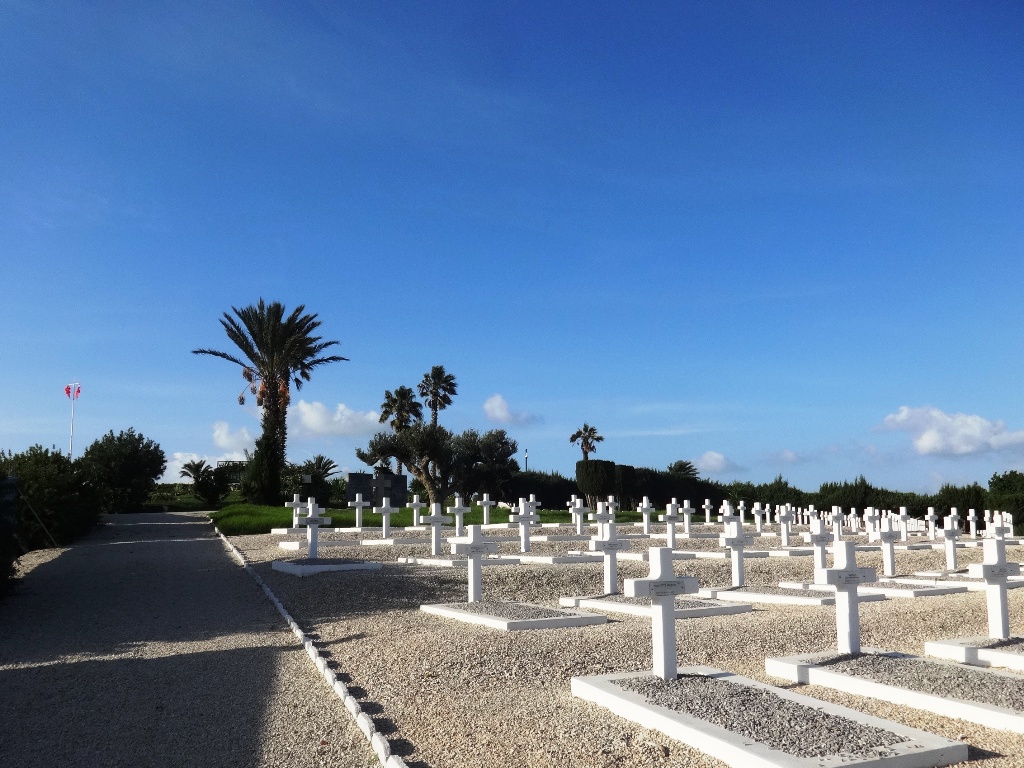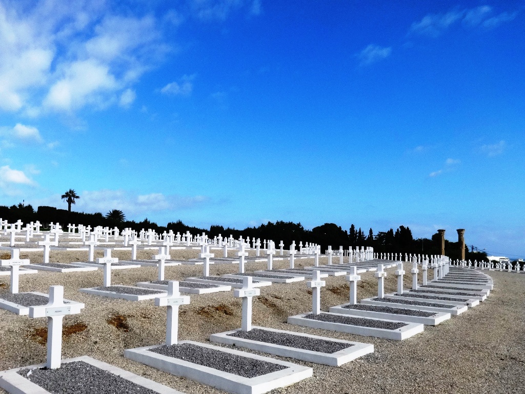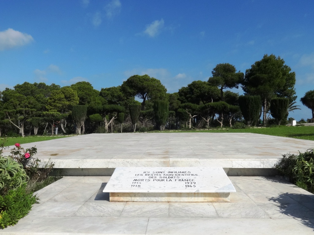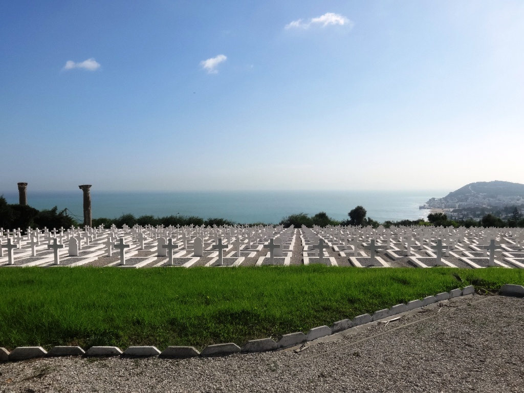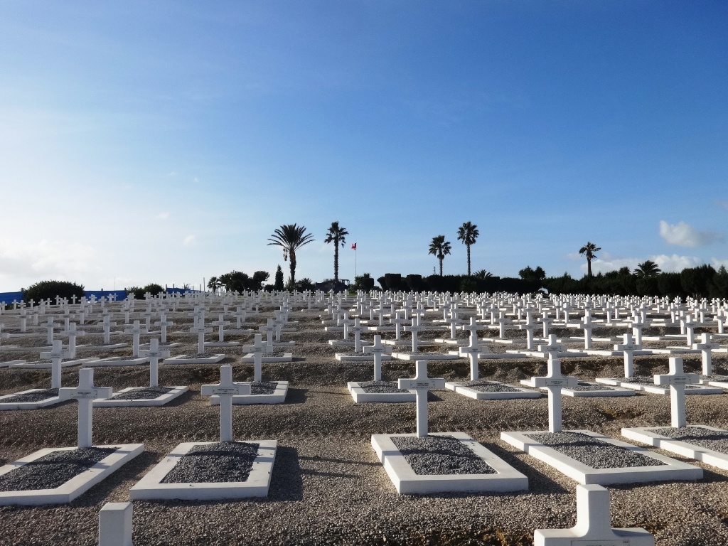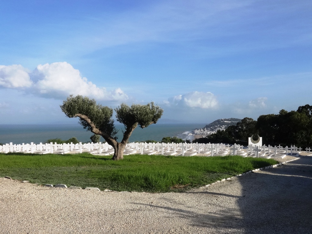 Qui a voyagé en Tunisie connait très probablement le site archéologique de Carthage, situé dans le nord-est de Tunis, ainsi que le tout proche et très réputé village de Sidi Bou Saïd, ses ruelles bordées de maisons blanches aux portes et volets bleus, ses vendeurs de jasmin, ses cafés typiques, … Mais un autre site tout proche, certes d’une nature très différente des ruines antiques et de l’intérêt culturel qu’elles présentent, ou bien des terrasses du Café des Délices où se prélasser en dégustant un thé à la menthe avec vue imprenable sur la mer, un tout autre site donc, vaut peut-être aussi le détour, pour qui voudrait bien y prêter attention et y sacrifier quelques minutes de son temps : c’est le cimetière militaire français de Gammarth, aussi appelé aujourd’hui nécropole nationale.