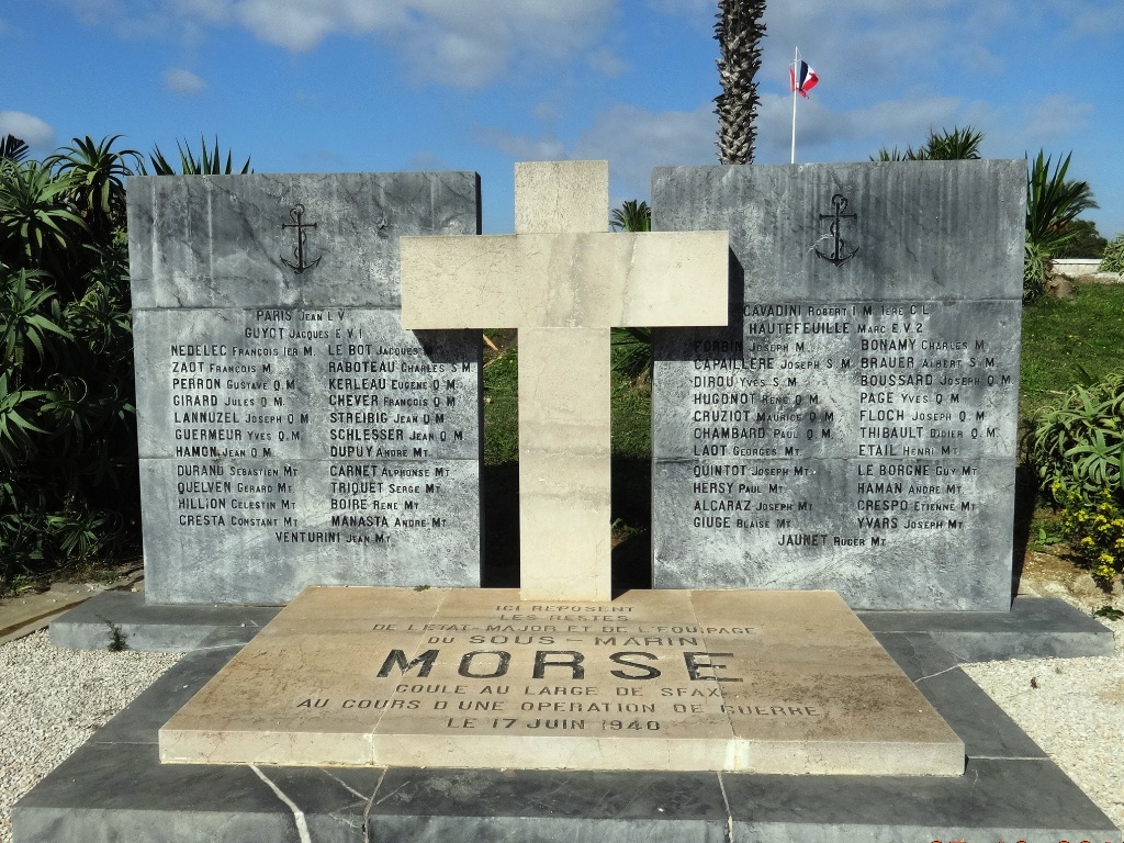 Six marins furent enterrés au cimetière de Sfax. Après la guerre, vers 1954, l’épave est relevée, et les restes mortels de l’équipage inhumés également à Sfax. Le 24 janvier 1957, lors d’une cérémonie officielle, le monument du sous-marin Morse est inauguré. En 1969, dans le cadre des opérations de regroupement sur la nécropole de Gammarth de l’ensemble des tombes militaires, les restes mortels de l’équipage du Morse y sont inhumés dans une tombe collective, sur laquelle sera ensuite réimplanté, après rénovation, le monument initialement érigé à Sfax.