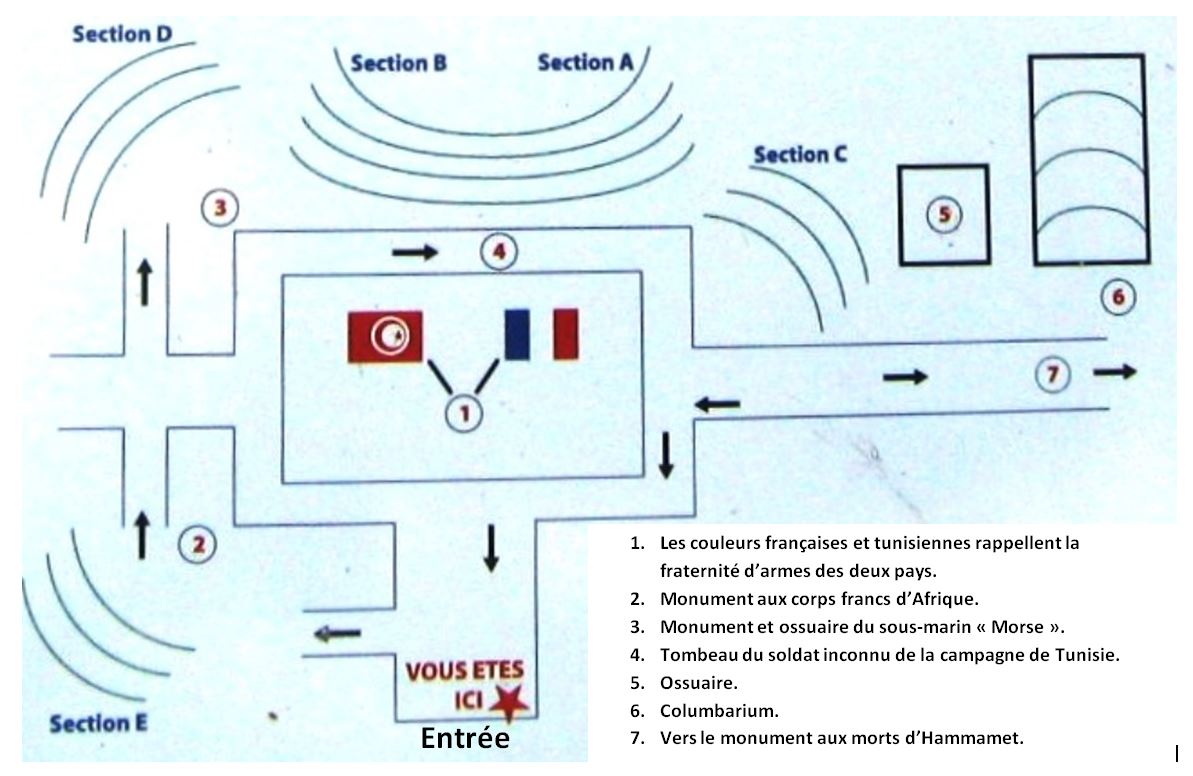 Le visiteur marin ou ancien marin aura aussi la surprise d’y découvrir, au détour d’une allée toute proche de l’esplanade centrale où flottent côte-à-côte les drapeaux français et tunisien, le mémorial et l’ossuaire de l’équipage du sous-marin Morse, coulé au large de Sfax le 17 juin 1940 (voir in fine).