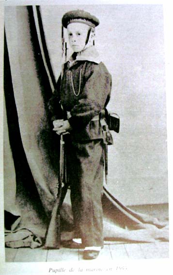 Au cours de la 2ème moitié du 19 ème siècle, les autorités maritimes et gouvernementales sont de plus en plus touchées par la situation très précaire de jeunes orphelins et notamment par ceux appartenant aux familles des gens de mer. Aussi à l'initiative du Vice Amiral Comte Gueydon, Préfet maritime de Brest, l'établissement des Pupilles de la Marine est fondé par décret impérial du 15 novembre 1862, dans un but humanitaire, à savoir orienter vers la carrière maritime :